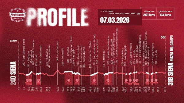 2026 waren die Gravelstrassen 80 Km jetzt für 2026 noch 64 km. Vor allem wurden 2 Abschnitte La Piana und Vidritta um die Hälfte gekürzt.