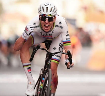 Foto: Tadej Pogacar balt zijn vuist nadat hij zo juist zijn vierde elf in totaal nu heeft gewonnen. Alleen Parijs-Roubaix nog. Foto: © LaPresse